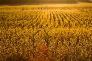 The golden light accentuated the yellow color of soybeans. I liked the effect of the rows that led the gaze away. What also caught my attention was these 2 isolated corn plants. I imagine they were grains from an earlier harvest that would have grown back.