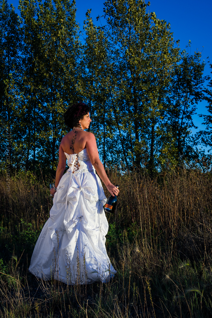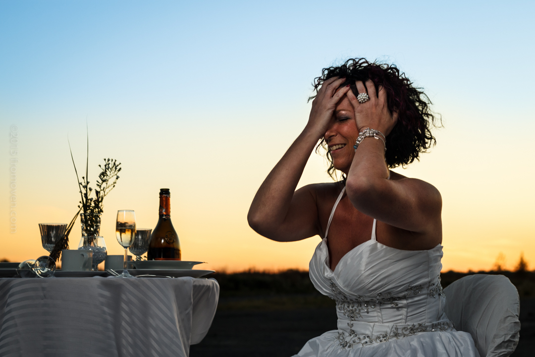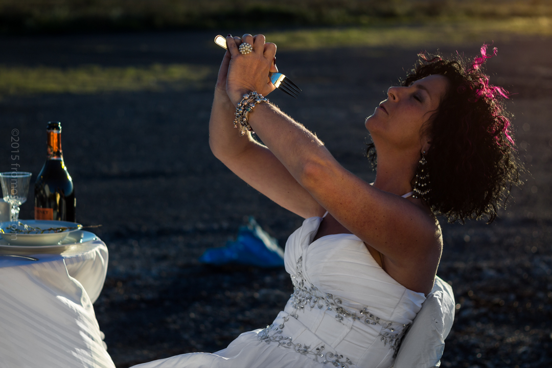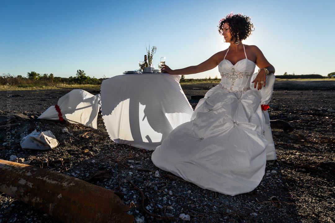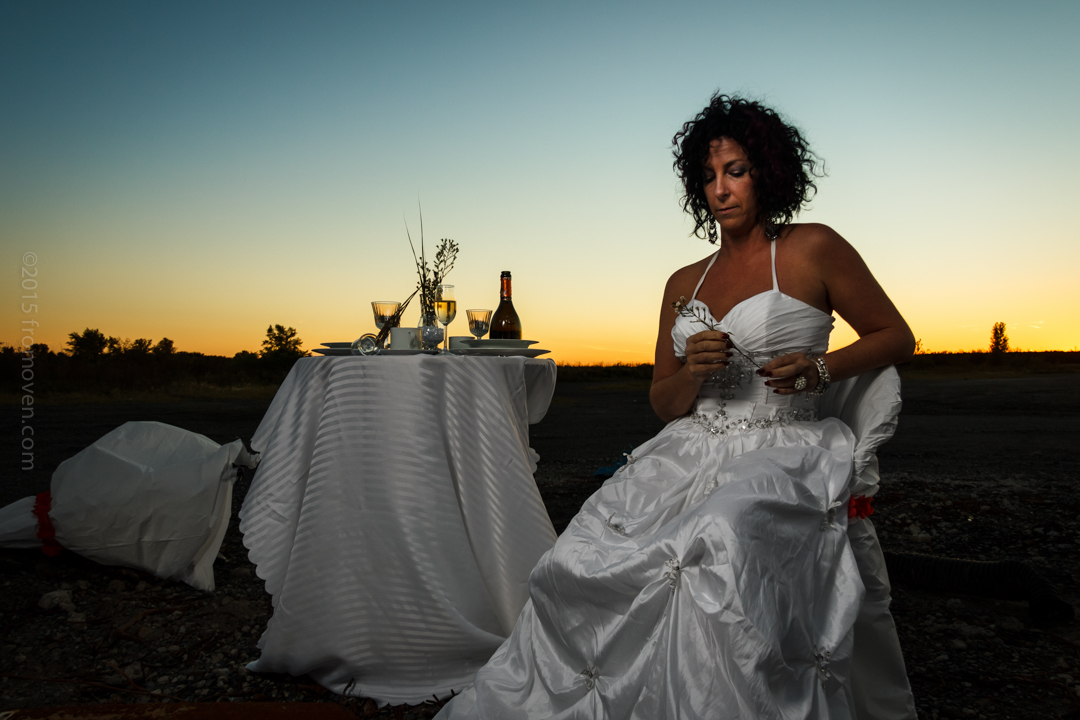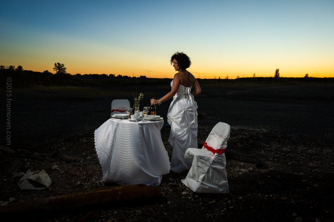 I was this summer that I really went ahead and built the necessary equipment to things in place. I made table that I could assemble on the spot, gathered the necessary dishes, scout a suitable location. Luckily, by the time I restarted the project, a flea market had burned down and it made a perfect spot for trashy pics of the “unwedded” (a great title conceived by my model Manon).