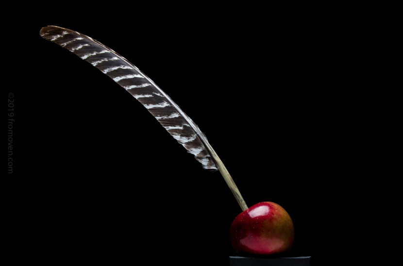 Ah que l’imagination est fertile lorsqu’on se retrouve avec une plume et une pomme à photographier. Pourquoi ne pas connecter les deux et se laisser bercer par les mots…