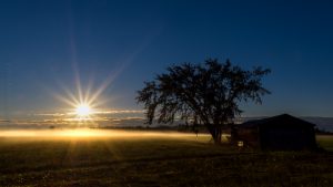 Le soleil se pointait à l’horizon et je voyais ma photo me filer entre les mains… J’ai préparé ma caméra, choisi une ouverture pour avoir un effet d’étoile avec le soleil puis j’ai fait quelques allés-retours pour m’arrêter momentanément sur le bord de la route pour prendre ma photo. Comme je l’avais anticipé, il y avait de la brume!