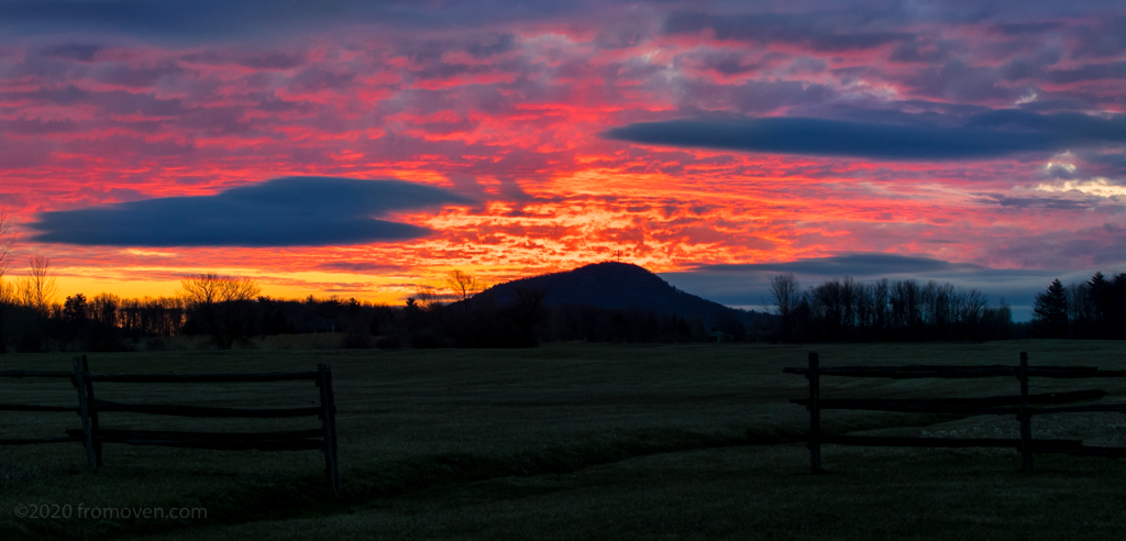 Heureusement, sur cette route il y avait cette clôture intéressante qui me permettait d’encadrer un peu la montagne au loin.  Je n’ai eu que quelques instants pour arrêter l’auto sur cette route, clignotants d’urgence activé pour débarquer et prendre la photo.