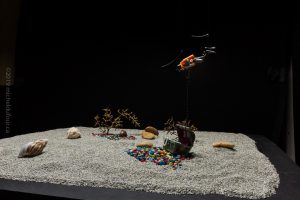 I started by putting a background on a foam board with aquarium rock. I had thought of using a green paper in order to replace it in Photoshop. Then I added some elements to make this background interesting. Notably, “mini-trees” that are branches of bunches of grapes, shells and a chicken bone…