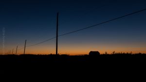 At the intersection of the Singer and St Mark’s road, I stopped and looked for a way to arrange my shot. I walked back and forth until I had the desired framing. This is the one I found most interesting: the small barn/shed framed by the electric line fleeing towards infinity.