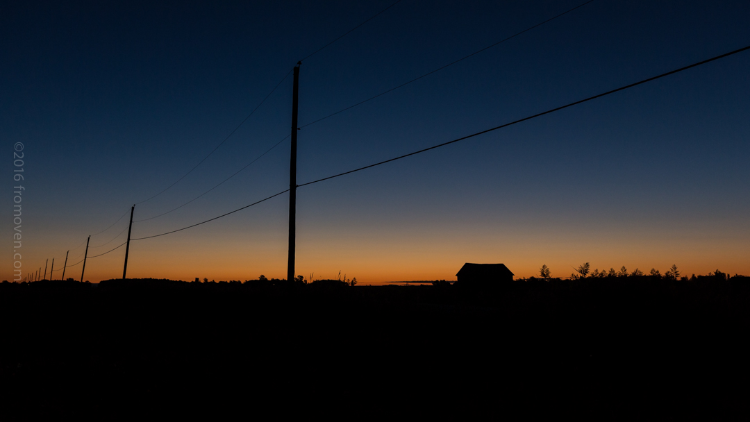 I drove on a known route that I often used in search of images: La montée Singer in St-Philippe de Laprairie. The sun began to diffuse its typical dawn light: the orange band below the dark blue-sky gradient. It is a view that I never get tire of watching.