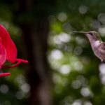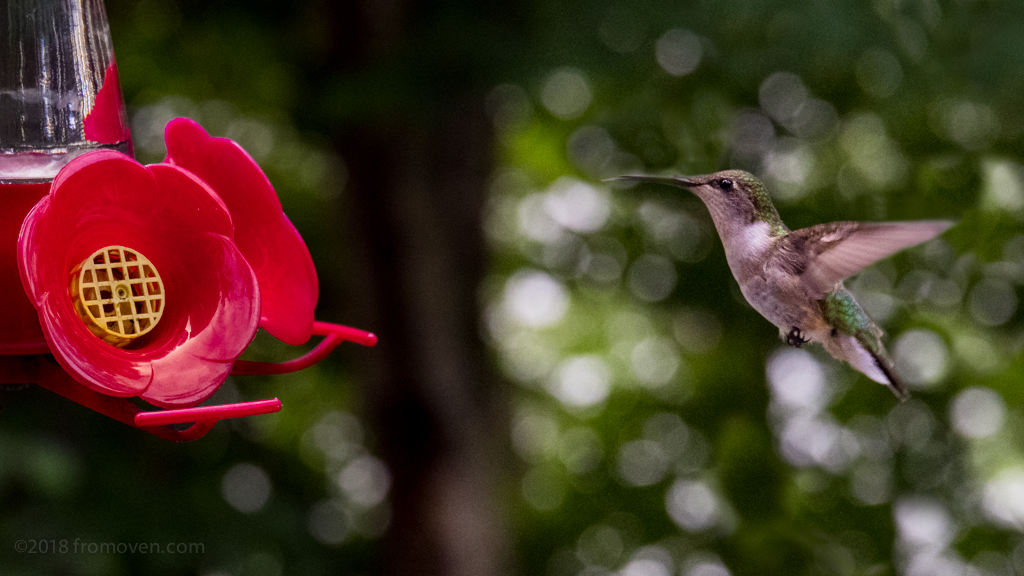 I installed my camera on a tripod with a trigger and selected the burst mode to maximize my chances; God knows these birds can move so quickly! I then tried to compose the image to have the least possible white areas caused by the holes between the leaves of the trees. In my first attempt, I used a zoom to be relatively “far” from the feeder (at about 1 meter because of the minimum focus distance) so I would not disturb the hummingbirds. Unfortunately, the lighting conditions were not optimal and the speed ended up being quite slow despite a fairly high ISO (3200-6400). In addition, I had to reduce my depth of field to have a “reasonable” speed. To make matter worse, it was windy: the feeder was swaying in the wind and it was thus getting out of focus.