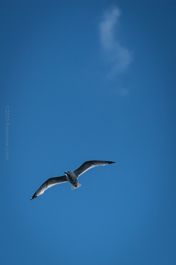 This seagull picture was made with my 70-200mm while it was circling over the boat.  It was the end of the afternoon and the sun had the right angle to light up the seagull’s feather from behind.