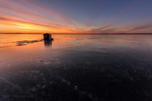 I was on a photo spree: the colors changed as the minutes went by. Unhappy with my composition I had from the shore of the lake, I looked up and noticed this fishing hut at large; It was about 500 meters from my position. I thought that would be interesting. I had my two cameras mounted with two different lenses (wide angle and small zoom). As I was afraid to miss my images, I walked quickly, and then ran to the fishing hut (while being careful not to fall on the ice).