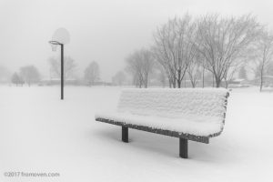 Once in the park, I headed for this basketball and a bench located next to it. I framed the basket to have it in a point of interest (on a third for the photo enthusiasts!) and the bench at the opposite. With the sticky snow and the fog, it gave a certain air of desolation, hence the title: the game is over!