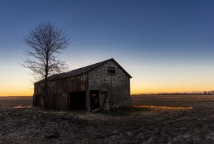 Retour vers le futur… au printemps 2017, je patrouille les rangs de campagne en vue d’une photo de couché de soleil et je m’adonne à passer devant la grange. J’ai remarqué que le soleil aller s’éteindre à l’horizon. Je stationne donc mon auto près de la grange et je m’installe pour attendre le moment propice. J’ai examiné les lieux pour choisir le meilleur angle, fait quelques essais de photos pour finalement prendre un angle similaire à la photo faite précédemment. Par contre, j’ai choisi de me rapprocher de la grange tout en utilisant la même lentille
