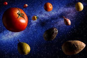 Pendant que je créais mes photos en rapport avec le thème de la bouffe, j’avais fait une image avec des fruits et légumes orbitant dans l’espace. Dans le montage de cette image, j’avais isolé une patate douce sur fond noir. C’est en la regardant distraitement que j’ai réalisé qu’elle ressemblait un peu à une surface lunaire…
