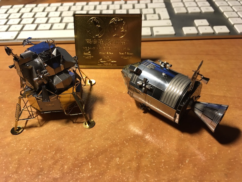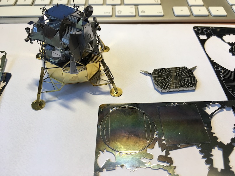 Il ne m’en fallait pas plus pour que l’imaginaire se déchaîne pour faire une mise en scène. J’avais pas mal réglé la portion « planètes » avec mes aliments comestibles. Je souhaitais représenter un vaisseau spatial et l’idée de mettre en vedette le fameux LEM de la NASA s’étant posé sur la lune vers la fin des années 60 m’interpelait. Le dilemme: trouver un tel objet presque 50 ans plus tard!