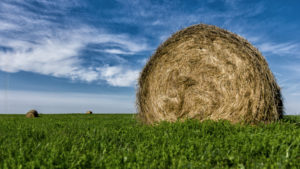 Cette fois-ci, j’avais un autre plan en tête: une prise de vue différente. Le ciel était intéressant avec ses nuages. Je me suis avancé dans le champ et j’ai commencé à composer ma photo. Après quelques prises, j’ai arrêté mon choix sur celle-ci: prise de vue basse avec l’appareil à ras le sol, mettant l’emphase sur le rouleau qui était à 2 ou 3 mètres, une petit focal pour inclure d’autres rouleaux et finalement l’horizon sur un tiers.