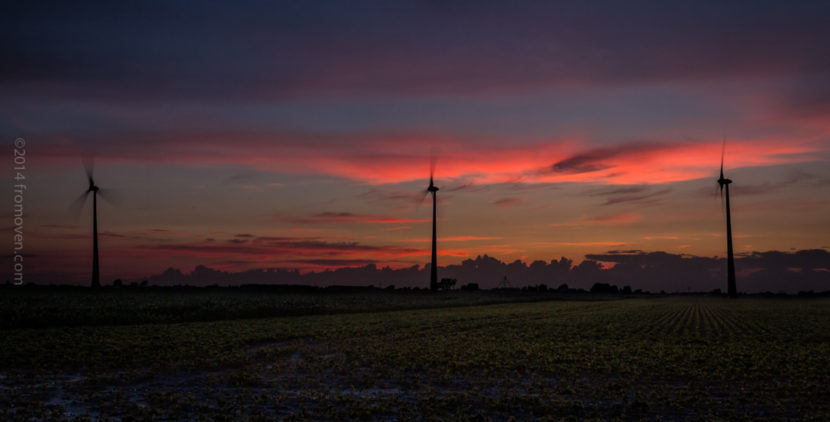 L’endroit où j’ai photographié ces éoliennes se trouvent environ à une demi-heure de mon domicile. L’an passé, j’avais circulé à cet endroit et me suis dit qu’il serait intéressant d’y revenir durant un couché de soleil. J’ai utilisé un site Web (www.suncalc.net) ainsi qu’une application pour appareil intelligent, conseillée par un collègue photographe, Sébastien Trudeau-Dion: Sun Surveyor Lite. Le site Web me permettait de savoir à quel endroit se coucherait le soleil alors que l’application de téléphone intelligent de visualiser précisément où, a cause de la fonctionnalité GPS.