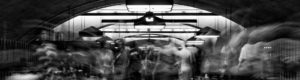 J’avais en tête un des thèmes du club photo: exposition lente. Évidemment, puisque c’était un vendredi de travail, je n’avais pas de trépied (surtout que le mien est assez lourd). J’ai cherché une façon de m’installer pour prendre ma photo. J’avais une lentille fixe de 28mm f/1.8 et à cette pleine ouverture, je n’avais pas de vitesse assez lente pour avoir un mouvement dans l’image, ce qui m’aurait permis de faire la photo à main levée. J’ai finalement opté pour une poubelle située au milieu du corridor pour y placer la caméra. À f/4, j’obtenais des vitesses assez lentes (2 secondes) pour avoir juste assez de mouvement dans la photo tout en conservant les formes humaines. Parfois il ne suffit pas d’être créatif dans l’image: le positionnement peut également l’être ! C’est ce que j’appelle les moyens du bord…