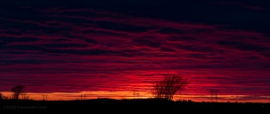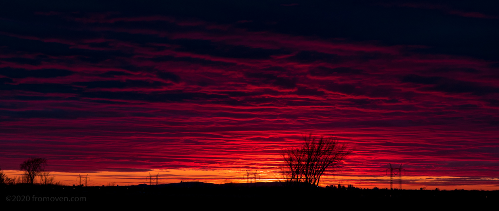 Puisque la couche de nuage était quand même très étendue, que le dégagement était pas mal constant d’un bout à l’autre de l’horizon, le soleil se reflétait sous l’ensemble des nuages. Une des rares fois où j’ai pu être témoin de ce miracle de la nature. C’était comme si un incendie s’était déclenché et que les flammes couraient au plafond; les nuages étaient rouges d’un bout à l’autre. Même un panorama ne pouvait rendre justice. J’ai tenté plusieurs prises tout en prenant le temps d’observer le spectacle avec mes deux yeux !