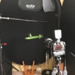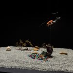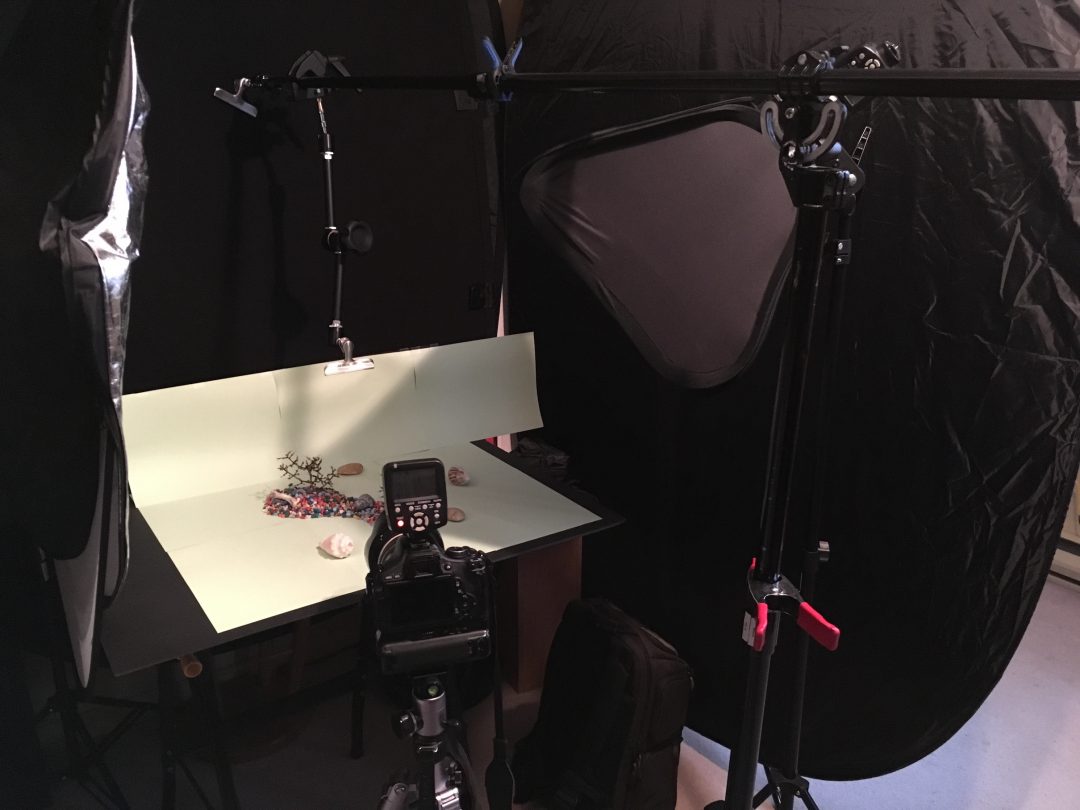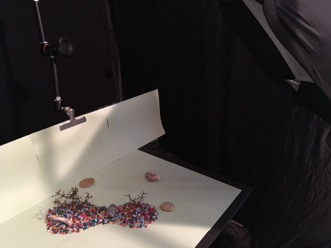 J’ai commencé par monter un fond sur un carton-mousse avec de la roche d’aquarium. J’avais pensé utiliser un papier vert dans le but d’en faire le remplacement dans Photoshop. Ensuite, j’ai ajouté des éléments pour rendre ce fond intéressant. Notamment, des « mini-arbres » qui sont des branches de grappes de raisins, des coquillages et un os de poulet…