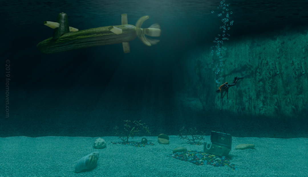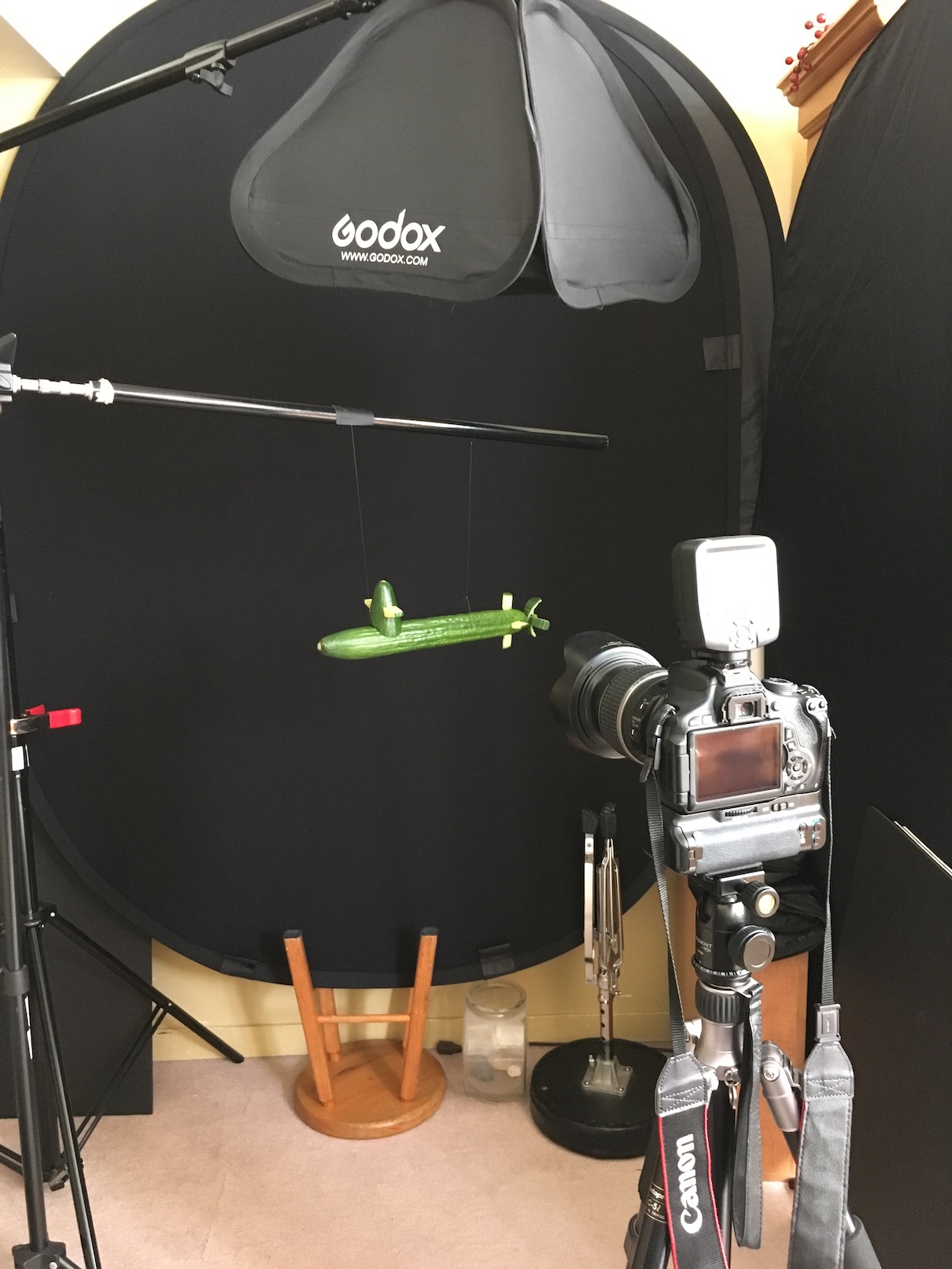 Dans les semaines qui ont précédées le thème de la bouffe, la préparation des images montrées auparavant a suscité une explosion d’idées (que je vais probablement continuer à exploiter ultérieurement). Ce jour là, j’ai remarqué la présence de concombres sur le comptoir de la cuisine. Ils étaient emballés dans un plastique, ce qui me donnait l’impression d’un long cylindre compte-tenu de la perfection de leurs formes. Ne me demandez pas d’où m’est venu cette idée mais j’avais le sentiment que les concombre ressemblaient pas mal à un sous-marin… C’est alors que c’est mis en branle le projet! (je souligne projet parce que ce fut tout une aventure!)
