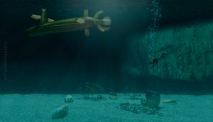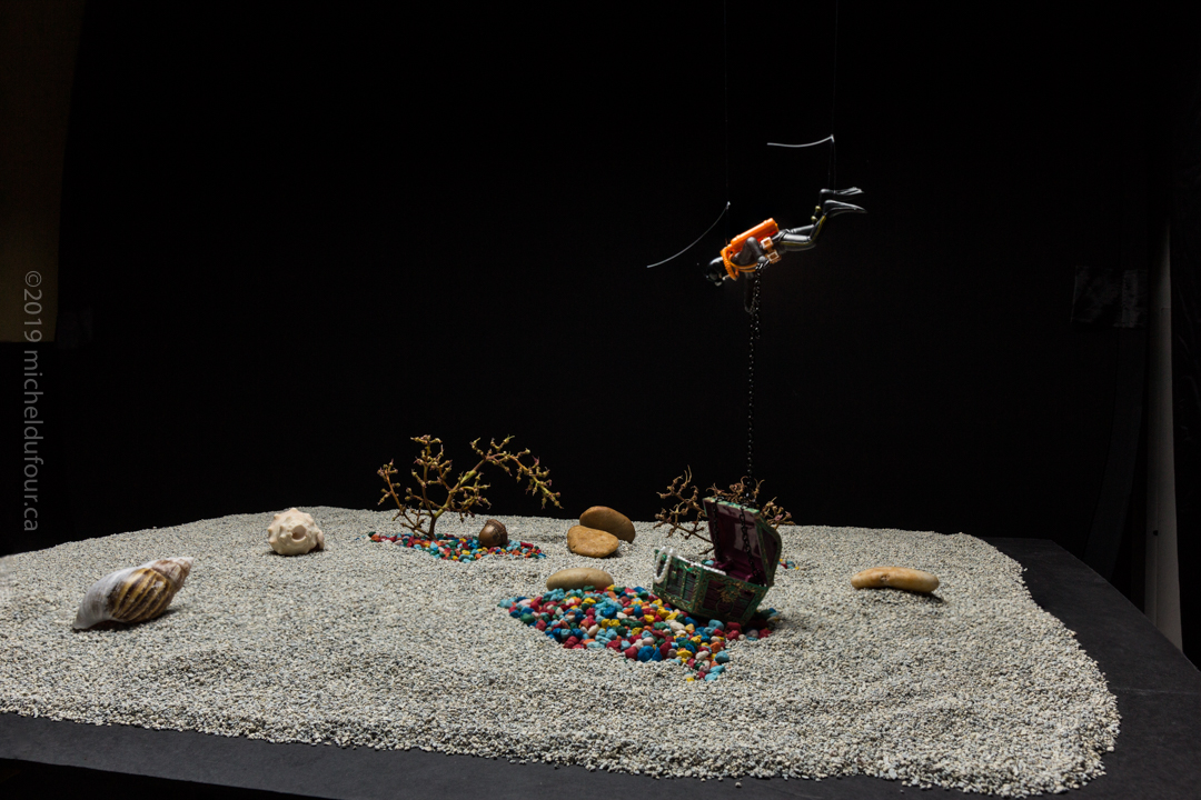 En dépit de ce « problème », l’incident m’a fait réaliser que ce montage n’était pas au point et que je devais le peaufiner. J’ai réalisé que le fond vert n’étais pas si une si bonne idée finalement. Encore une fois, le chat est « intervenu » dans l’histoire, j’ai remarqué que la litière pourrait faire un excellent fond marin.