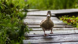 Lorsque nous étions arrivés, nous avions remarqué ce canard (en fait deux!) qui se promenaient aux alentours du camp. Donc, durant ce moment de solitude, j’ai marché sur le trottoir de bois et le quai. Lorsque ce canard m’a aperçu, il est venu vers moi, probablement pour que je lui donne à manger. Le plus drôle est qu’il faisait les allés-retours en synchronisation avec mes balades sur le quai.
