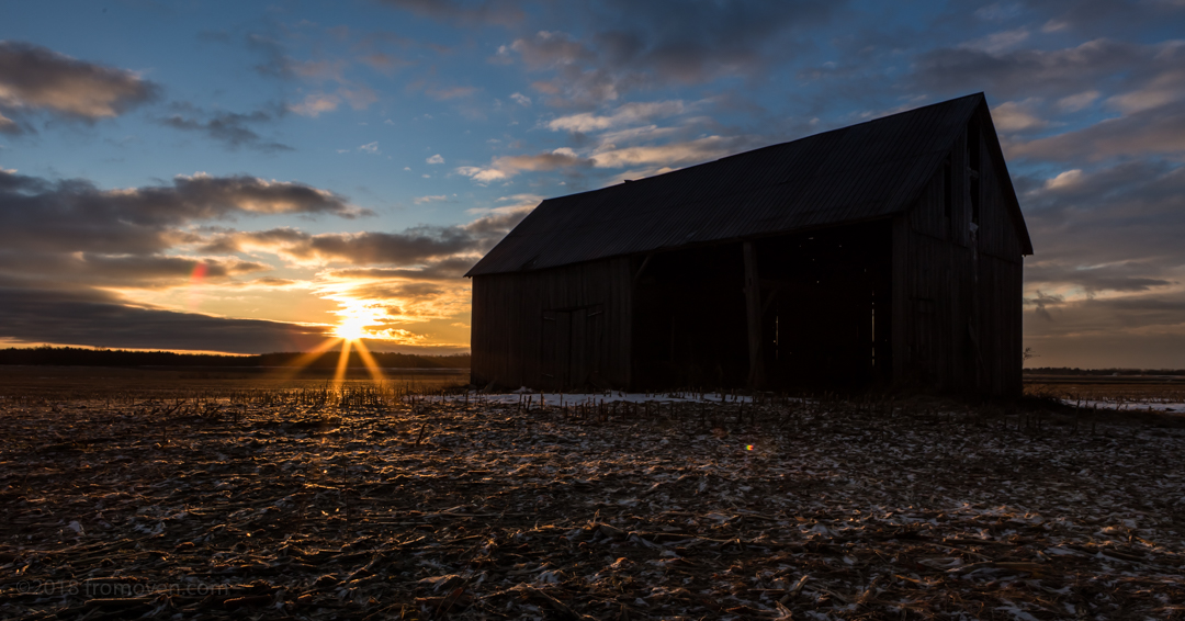 Au mois de décembre, l’hivers était reparti on ne sait trop où! La belle neige que nous avions avait été lavée par les caprices de Dame nature. Ce matin là, je m’étais levé assez « tôt » et je voyais qu’il y avait quelques nuages dans le ciel. Je me disais que les conditions seraient propices pour avoir des reflets de soleil sur ces nuages. J’ai ramassé ma caméra, un café et je suis parti à l’aventure. À ce moment ci de l’année, le soleil se lève assez tardivement, ce qui me donnait une marge de manoeuvre pour me déplacer et trouver un lieu intéressant.