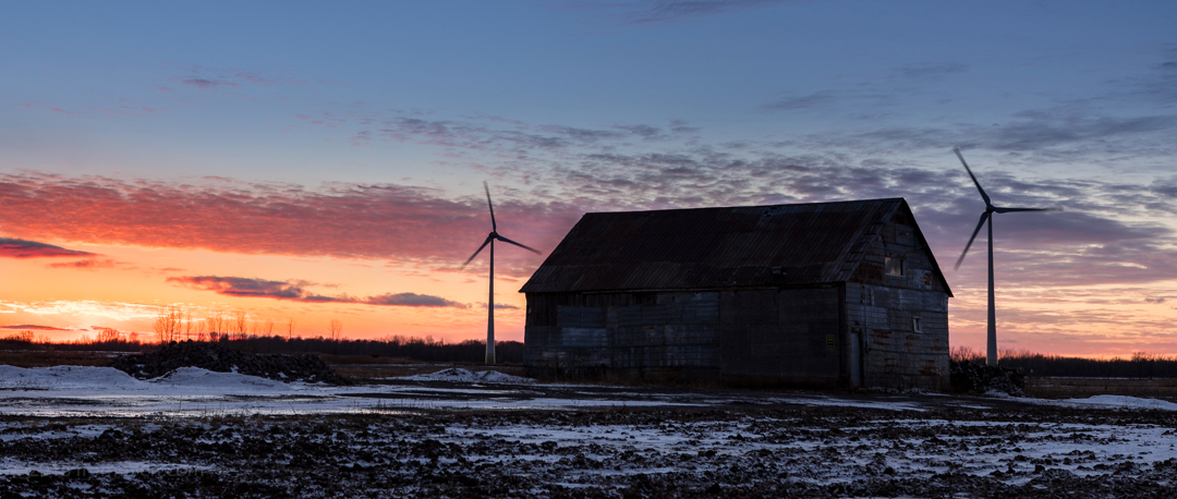 J’ai installé mon équipement rapidement et me suis déplacé un peu pour centrer la grange entre deux éoliennes. J’ai fait quelques poses en « bracketing » en prévision de les assembler en postproduction. Le soleil s’était caché derrière l’horizon et j’attendais que le soleil illumine les nuages. Le temps avançait et je devais penser à quitter les lieux pour retourner chez-moi, surtout que je m’étais éloigné pas mal…