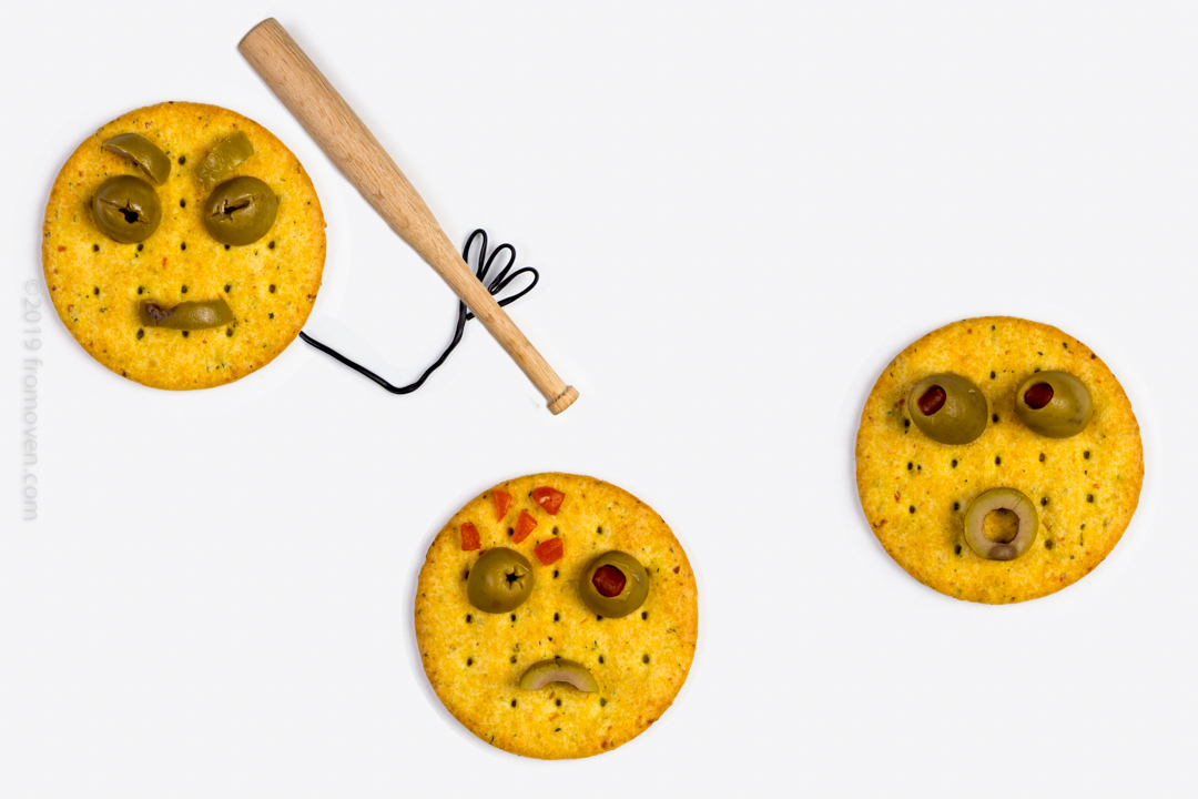 Je ne me souviens plus bien bien comment est surgi l’idée de mettre en scène de la bouffe. Je crois que c’est en observant des olives avant de la manger que j’ai remarqué que ça pouvait ressembler à un œil. Chemin faisant, j’ai élaboré ce scénario. J’ai sorti les olives pour les tailler au besoin. Ce qui est intéressant, c’est qu’en faisant le montage des craquelins, je pouffais de rire de voir le résultat!
